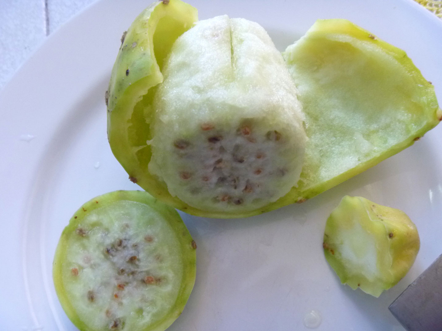 The cactus fruit is called tuna, and is not to be confused with the fish, which in Spanish is called atun. Tunas, or prickly pears, are commonly found in supermarkets. Peeling them is easy, although some varieties feature tiny, almost invisible needles, so it is important to hold them with a plastic bag or gloves as you cut them. This is why they are frequently sold pre-peeled and in plastic bags on the street. They are low in calories and an excellent source of Vitamin C. Chew them carefully as tunas contain many small seeds that are perfectly ok to swallow. In fact, you want to swallow the seeds as they are good for your digestive system.