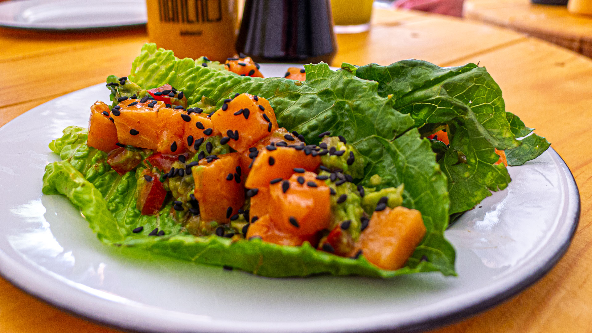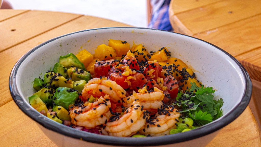 There is a small but nice selection of poke bowls to choose from, along with a yummy Hawaiian/Mexican merger: fish tacos served on lettuce leaves.