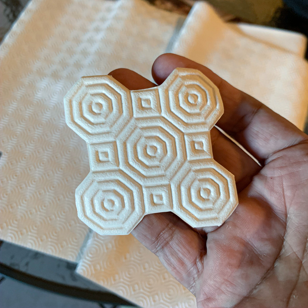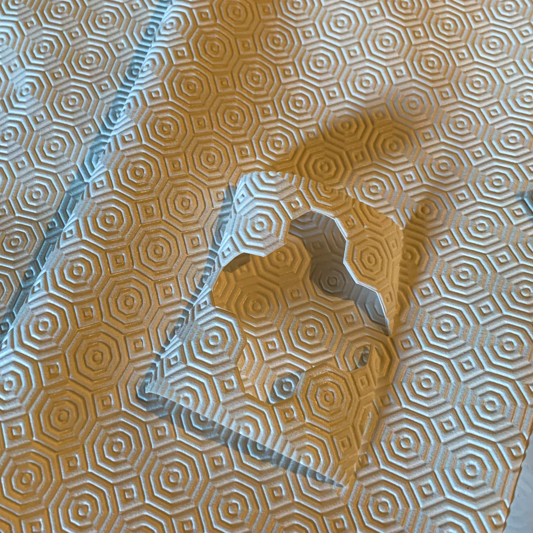 At the fabric store, I spotted these rolls of vinyl anti-skid mat and was drawn to the texture. They are soft and easy to cut with scissors, so I cut out a few pieces to decorate the box.