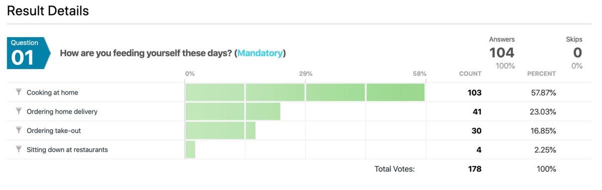 To get a sense as to where we are, I put together a small informal poll over a week ago to get some sense of where our community is when it comes to current restaurant behavior. To date, a little over 100 responses have come in; not enough to truly represent a community, but enough to extrapolate some insight.