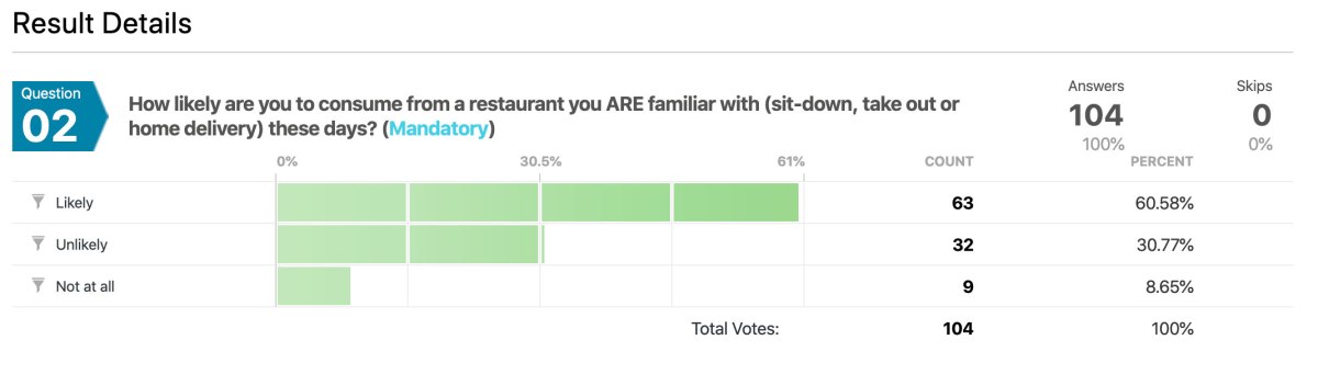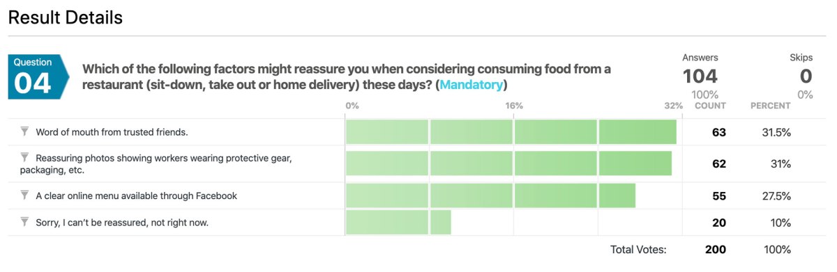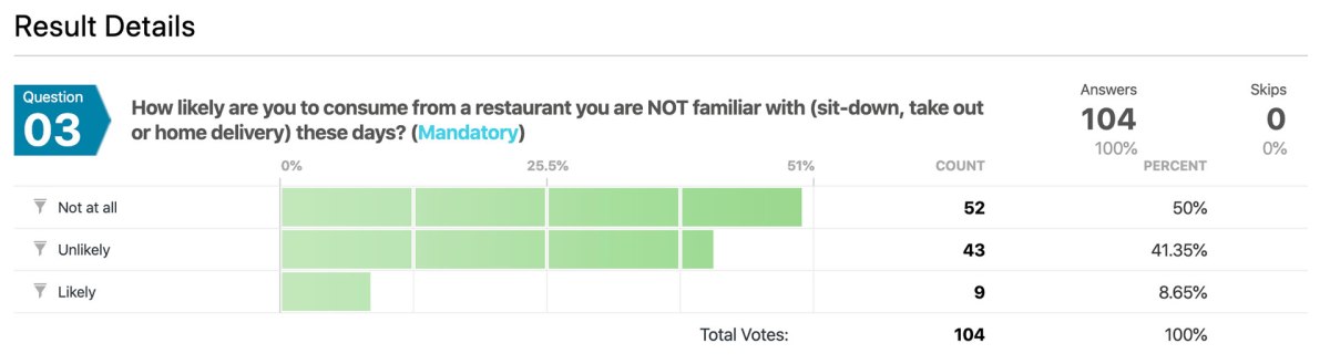 Clearly, we are not ready to tackle the unknown when it comes to going back to restaurants. Most of us are cooking at home, relying only on take-out/home delivery from places we already know, and not eager to explore new restaurant options. But word-of-mouth seems to weight heavily in our decision-making process. In order to help restaurants, we can do our share by: